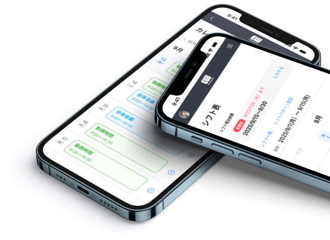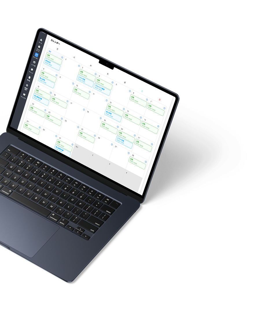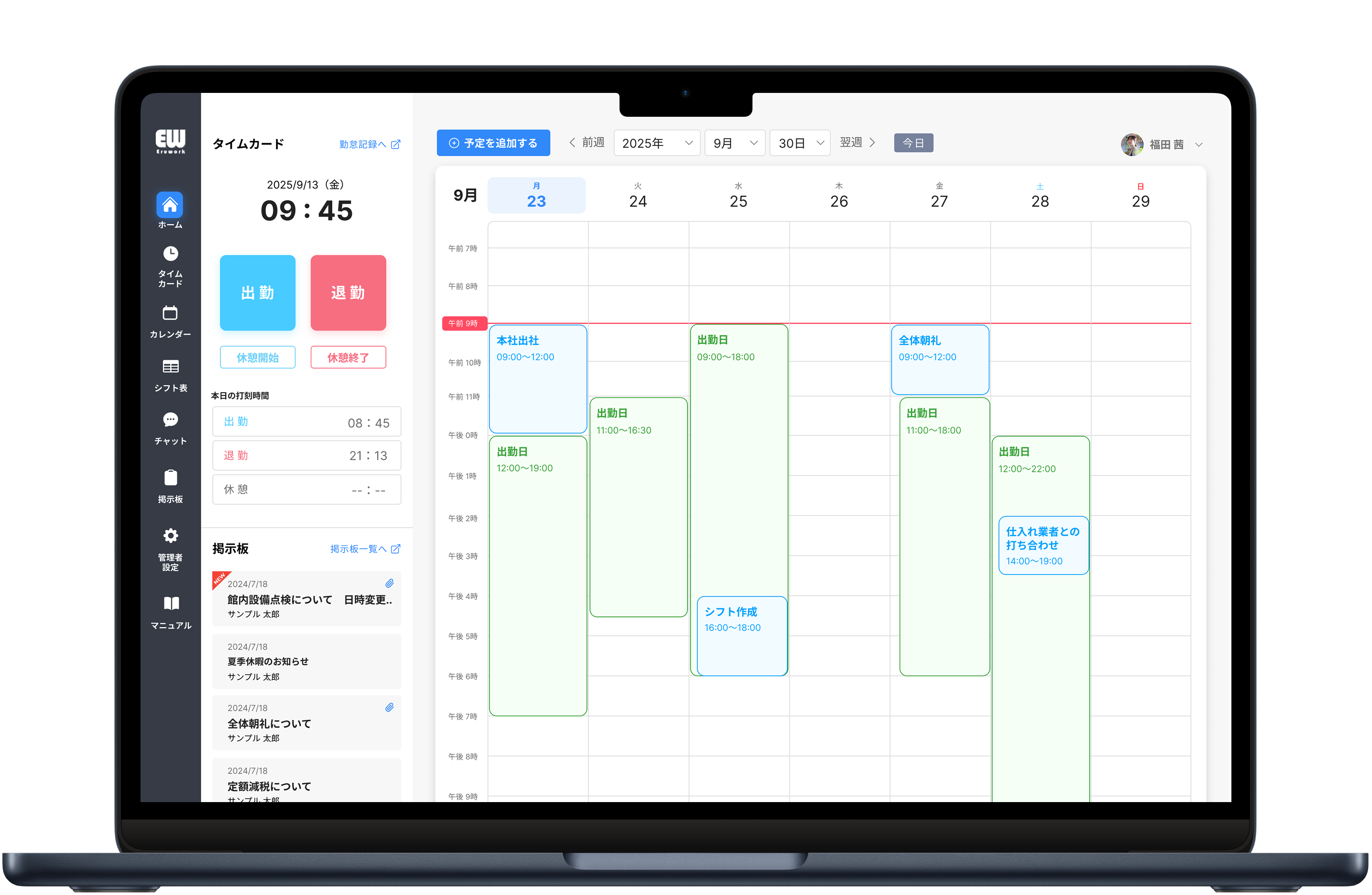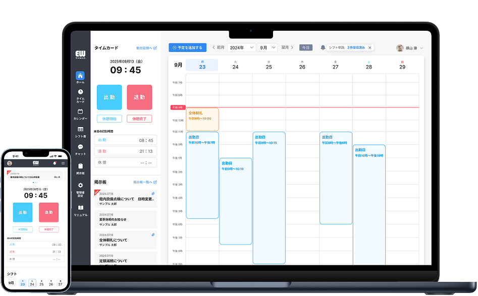 シフト作成から勤怠打刻、マニュアル管理、チャットや掲示板まで、必要な機能をワンストップで提供。