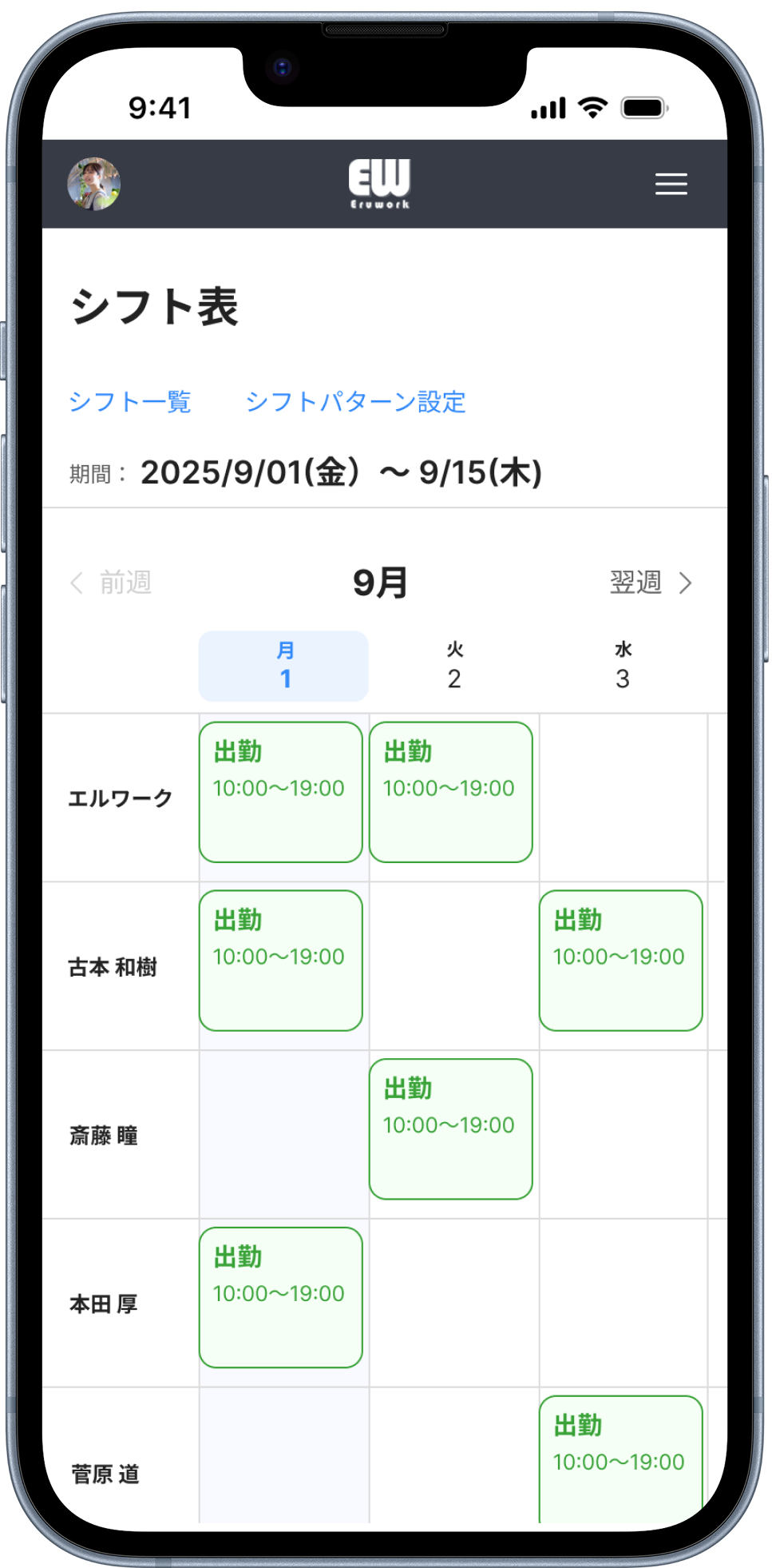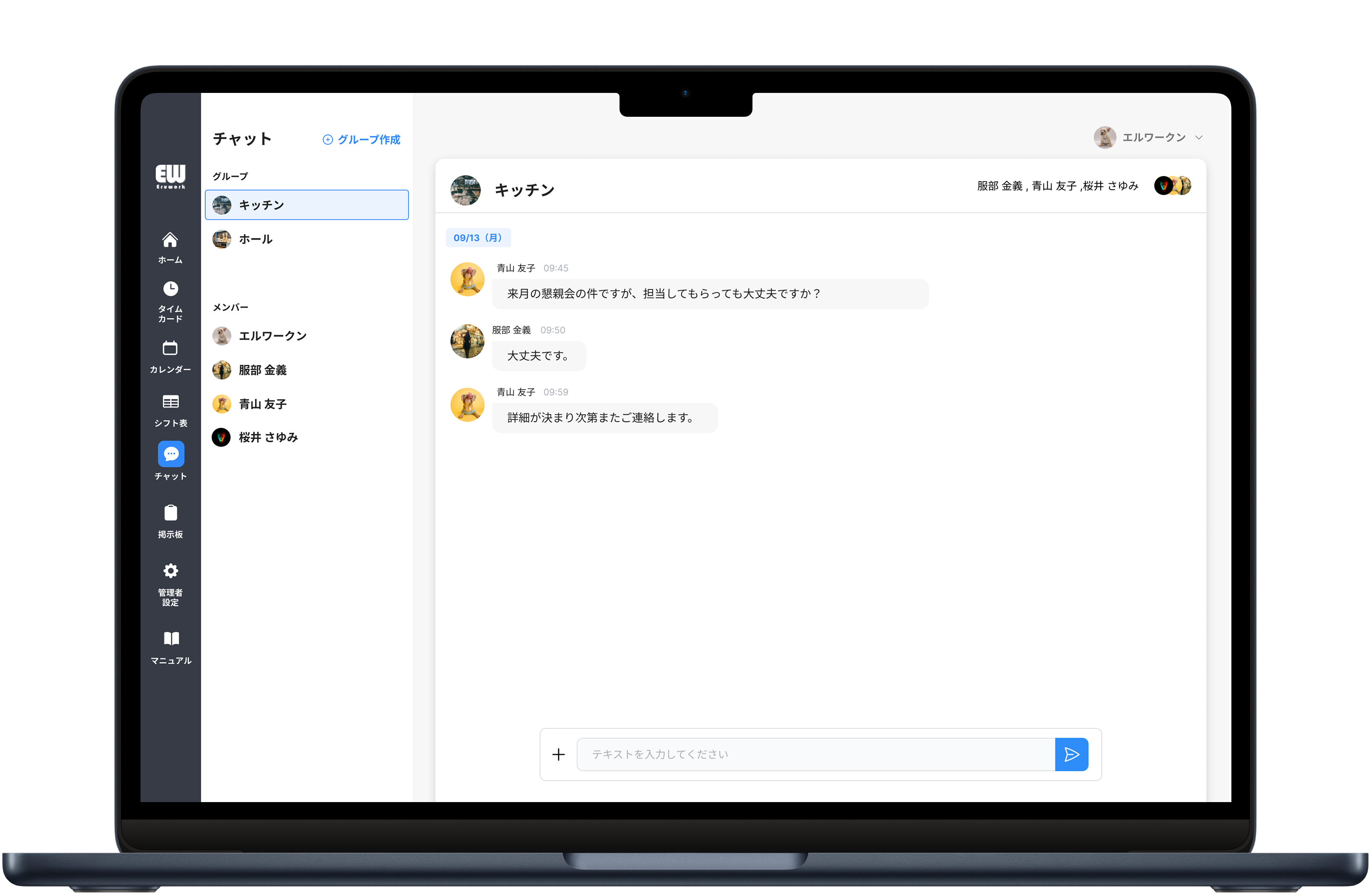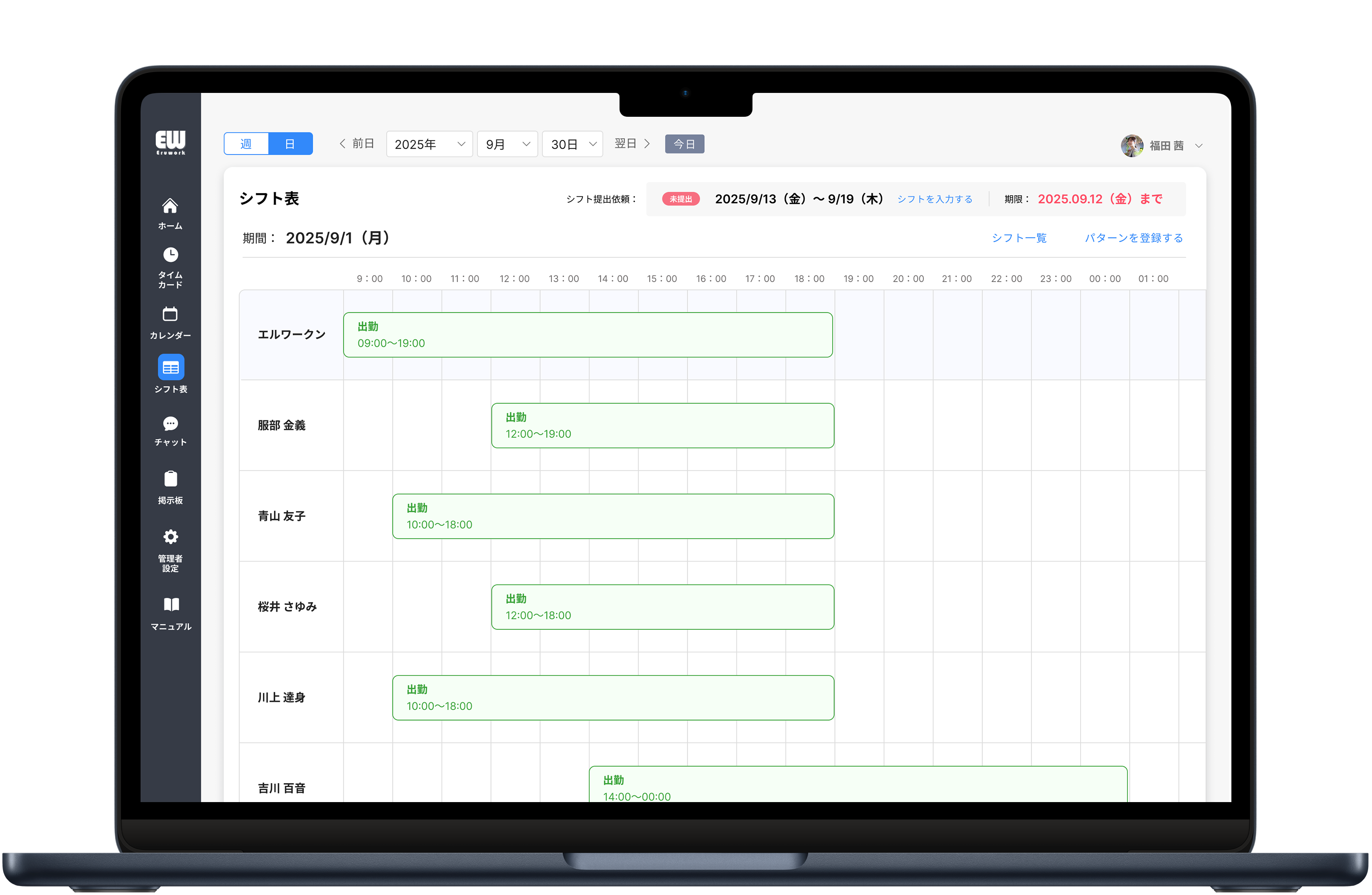 シフト作成から勤怠打刻、マニュアル管理、チャットや掲示板まで、必要な機能をワンストップで提供。