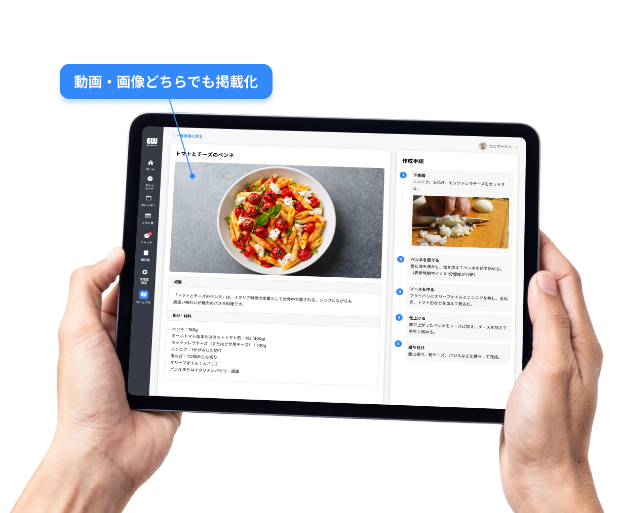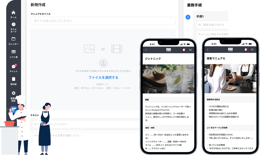 シフト管理、勤怠打刻、マニュアル作成、掲示板・チャットなどの機能を
